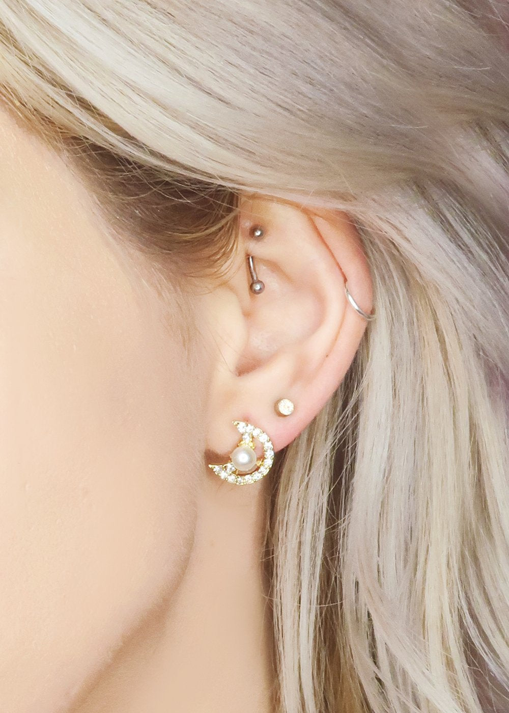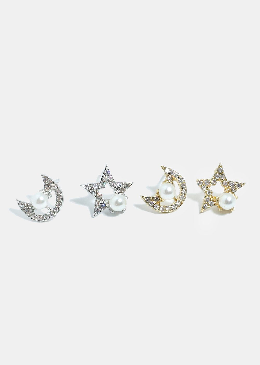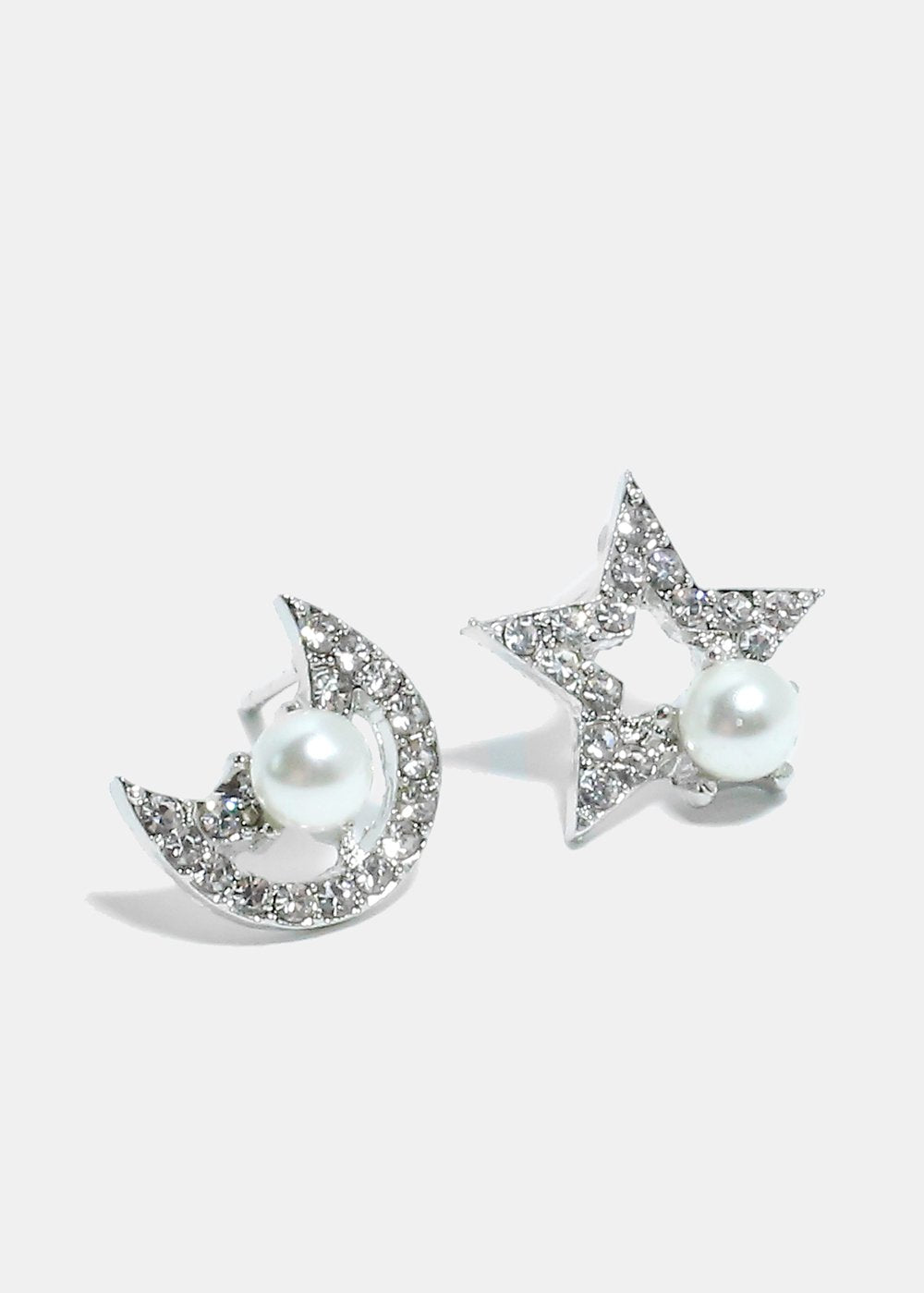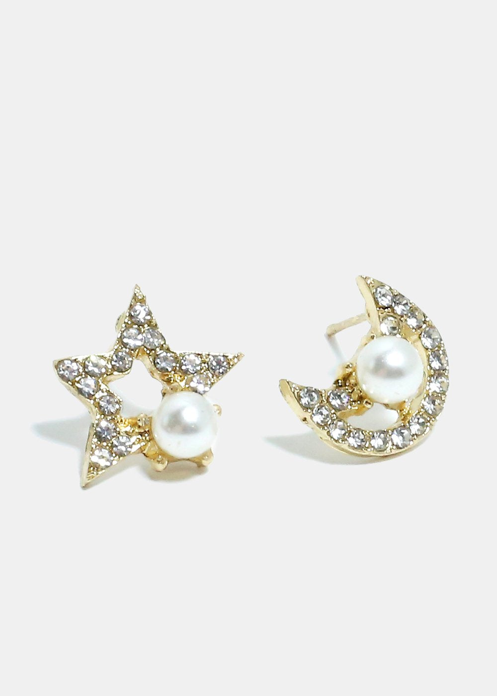 Charming astronomy themed moon and star earrings with rhinestones and pearl accents. A unique and super cute pair to keep in your collection. They add a pop of sparkle and a fun detail to any ensemble.