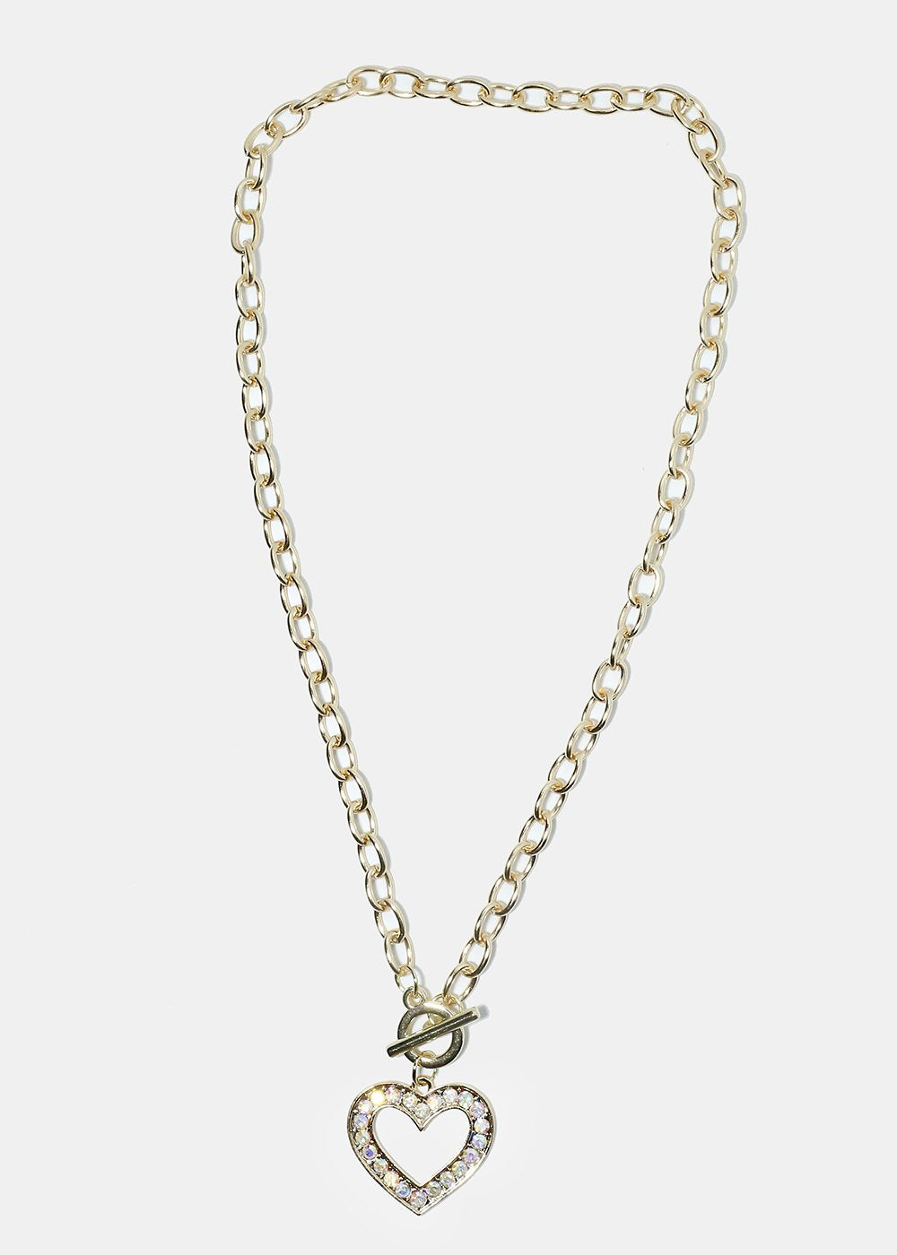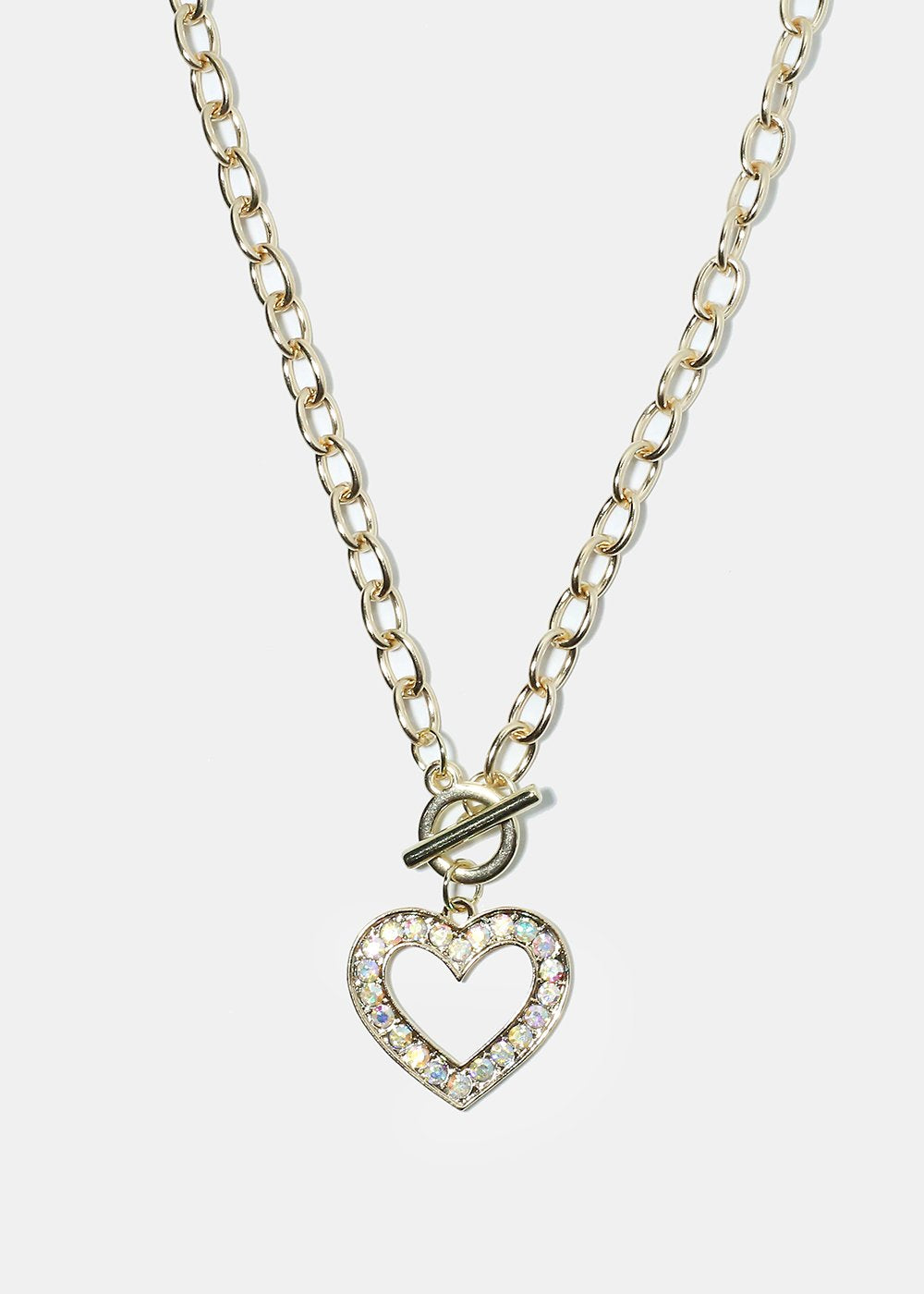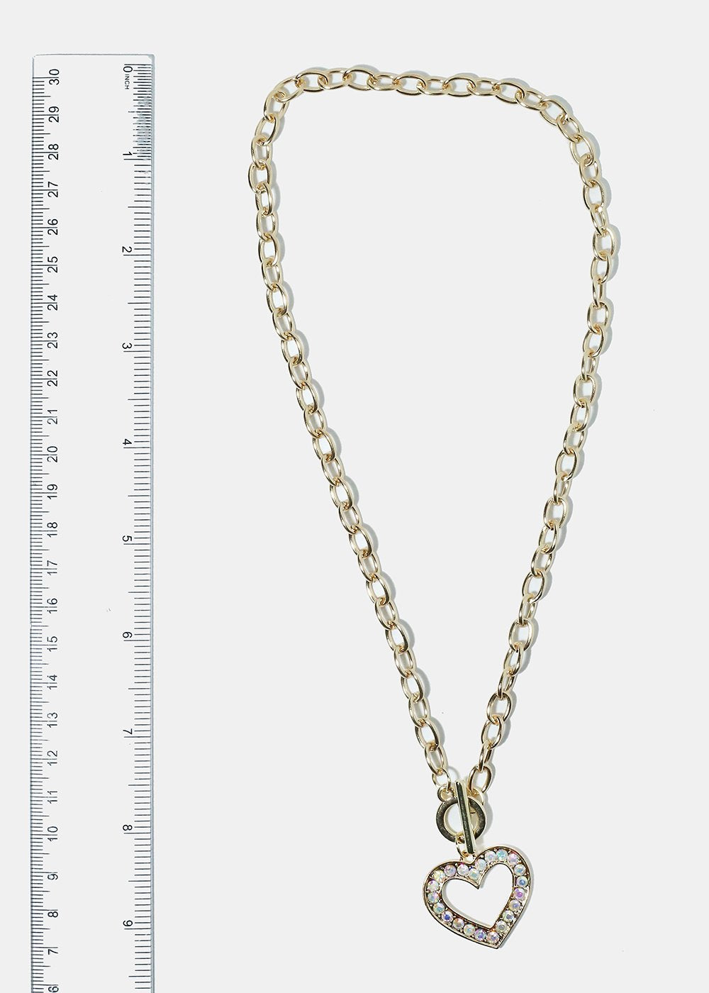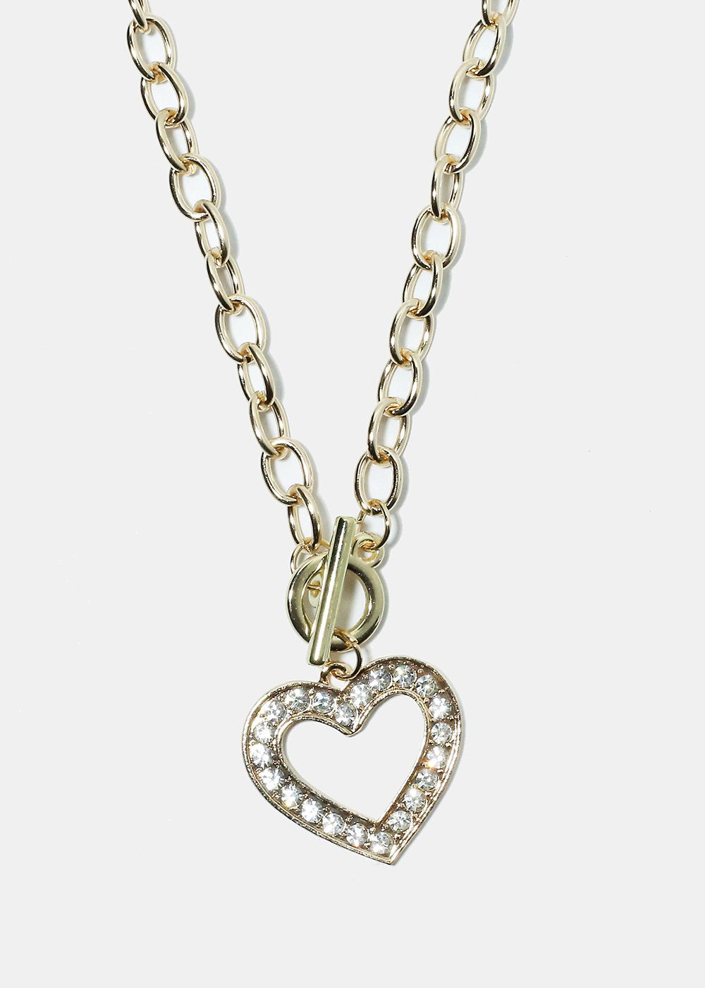 Charming rhinestone studded open heart pendant featuring a thick chain link necklace. A fun and chic style to add your ensemble that adds beautiful sparkles! Dress it up or down with casual or night out looks!
