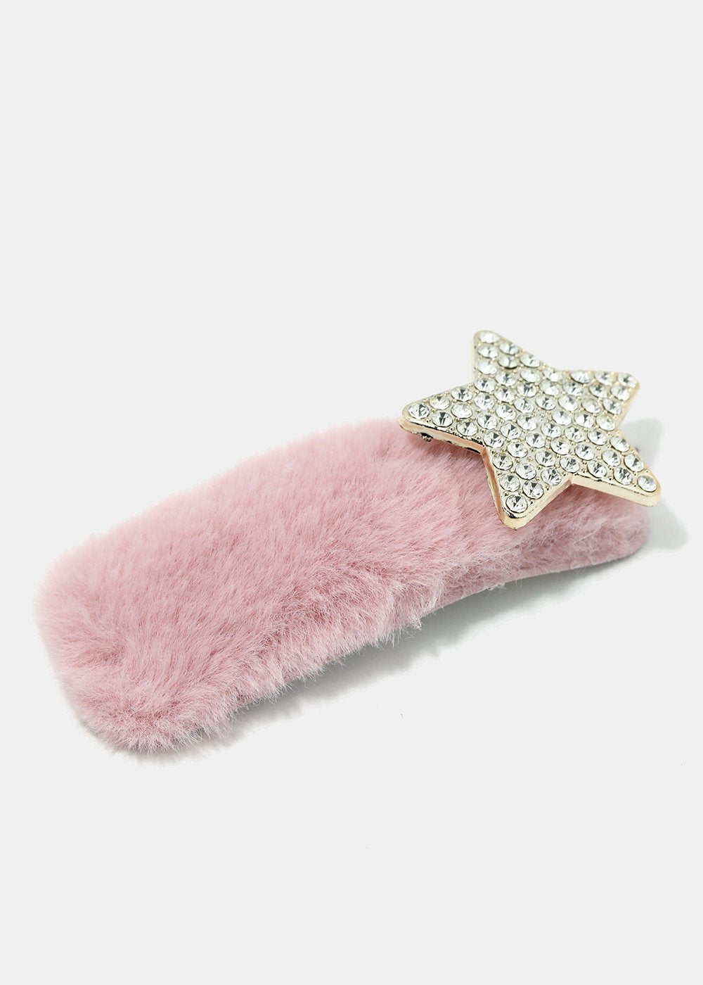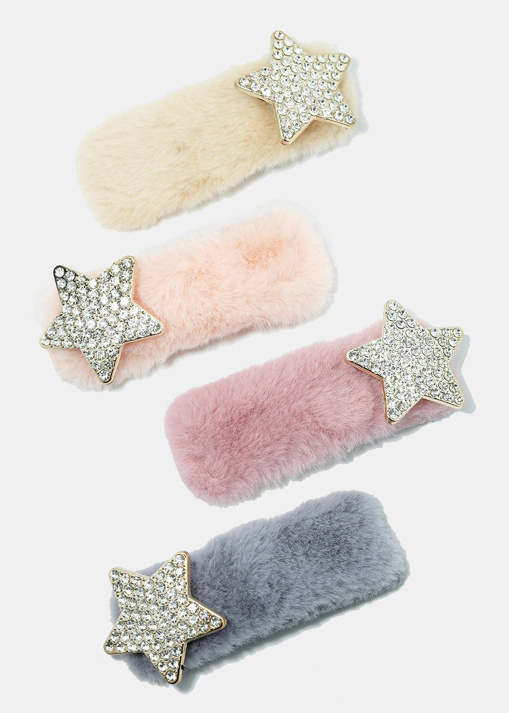 Fluffy and adorable fuzzy hair clips featuring a gleaming rhinestone star accent. These are super cute and super soft to the touch! Add a unique sweet touch to your hair-do! A must-have in your collection!