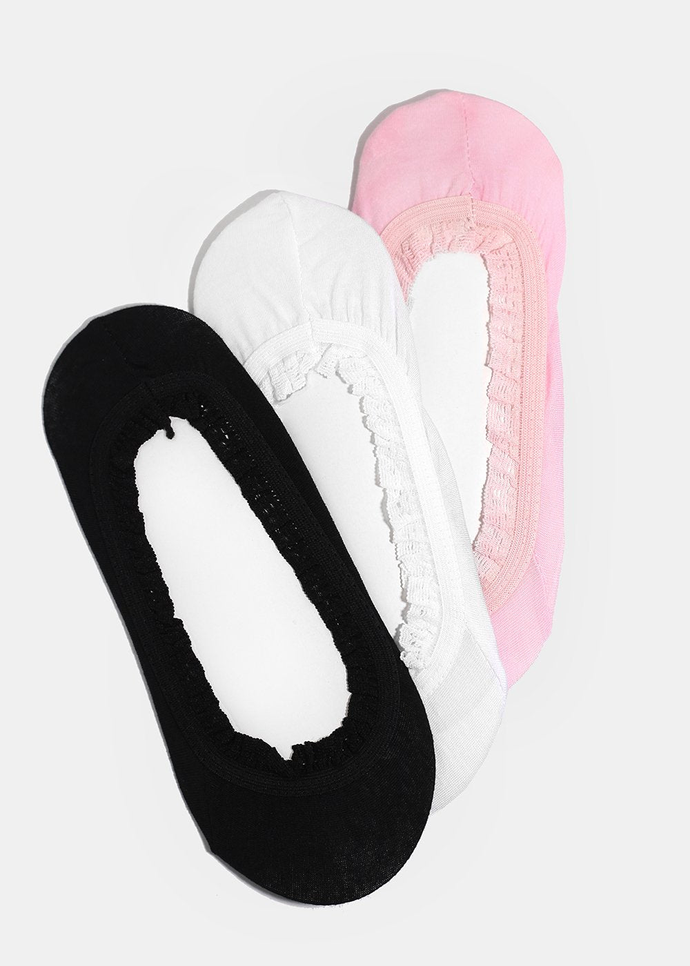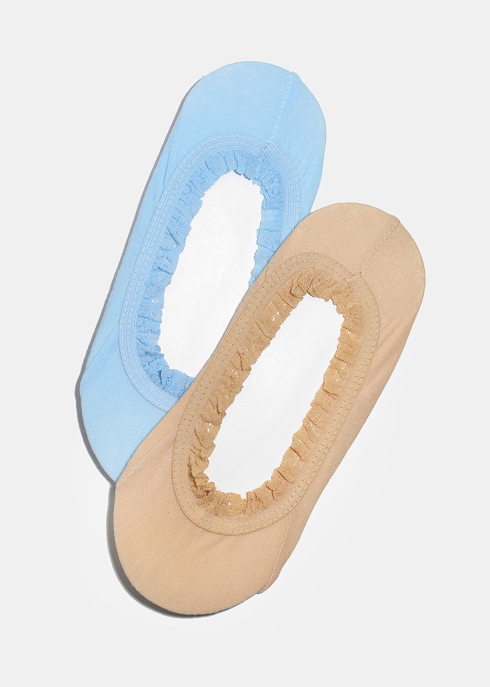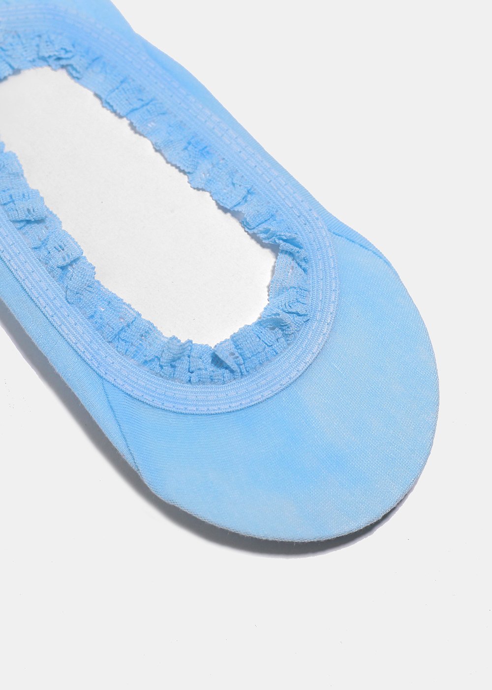 Soft and comfy no-show socks in solid colors with ruffle trim, perfect for wearing with flats! Fits women's shoe size 5-10.