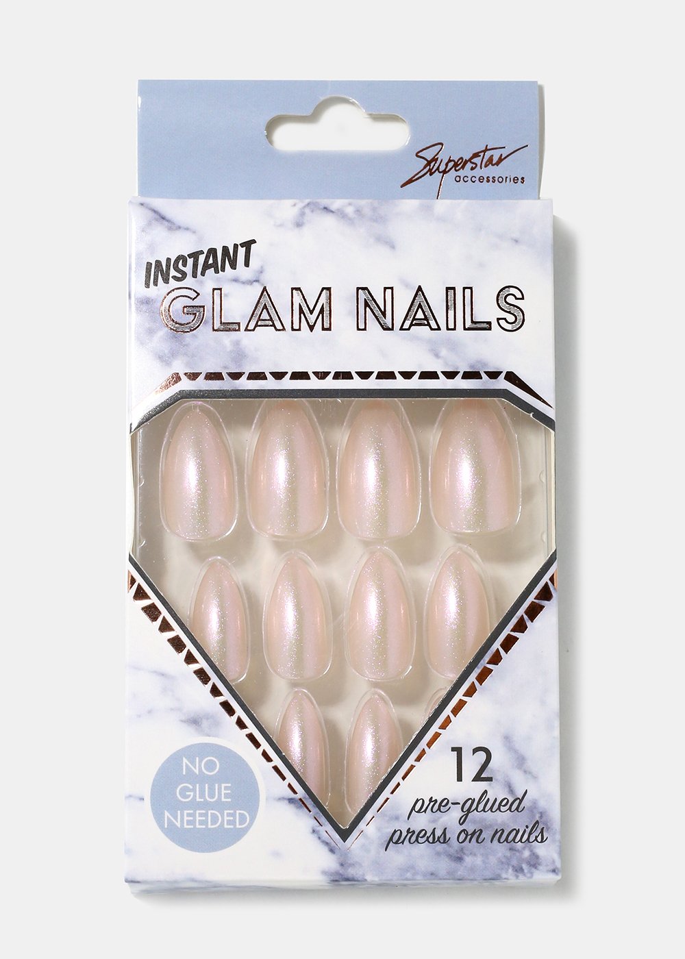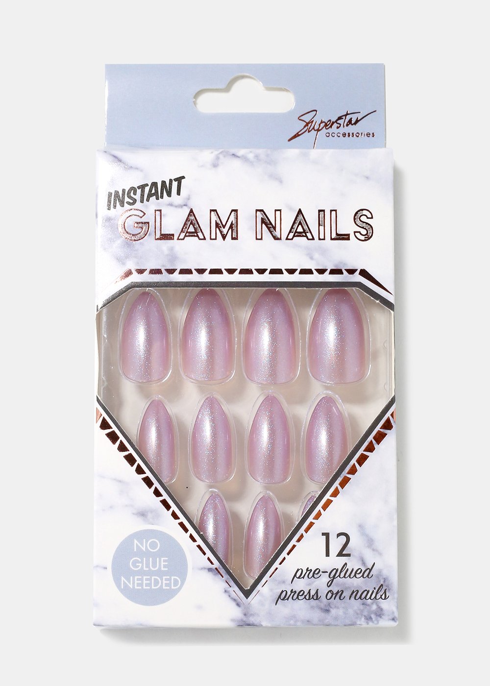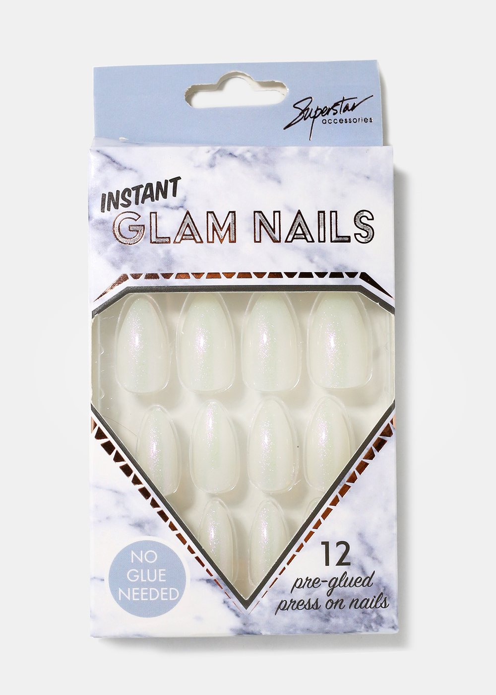 Pack of 12 almond-shaped press-on nails in gorgeous pearlescent shimmer tones. A fun look and easy to apply, no glue required!
