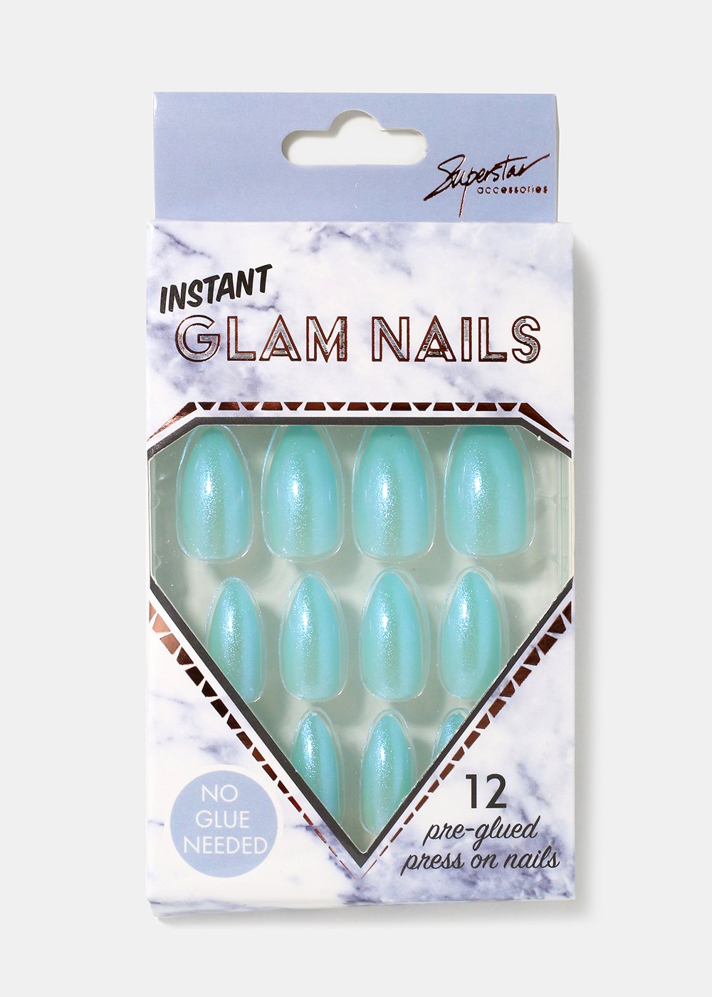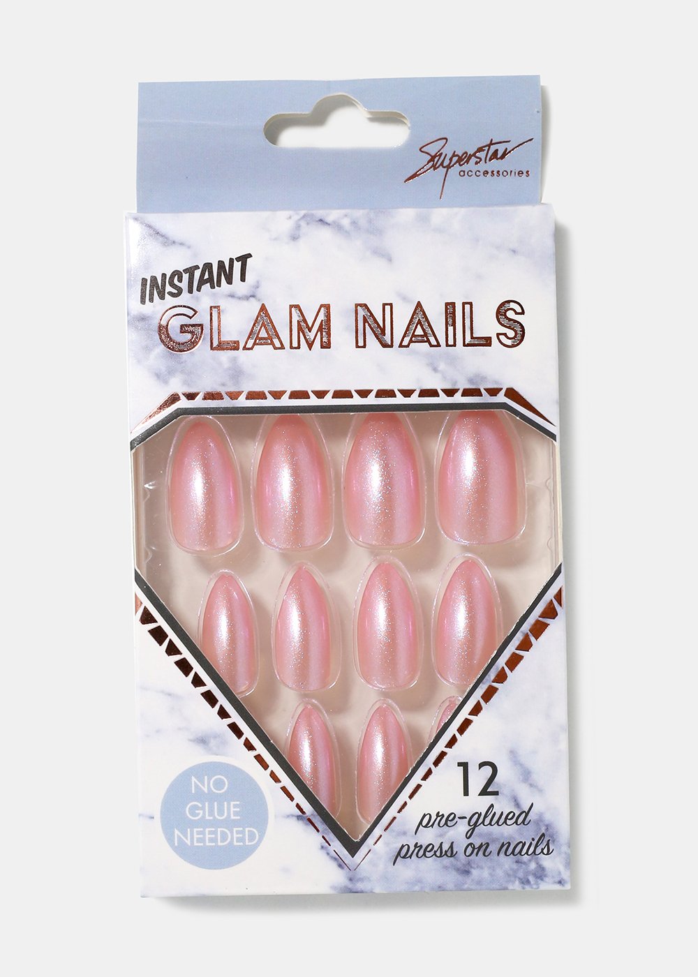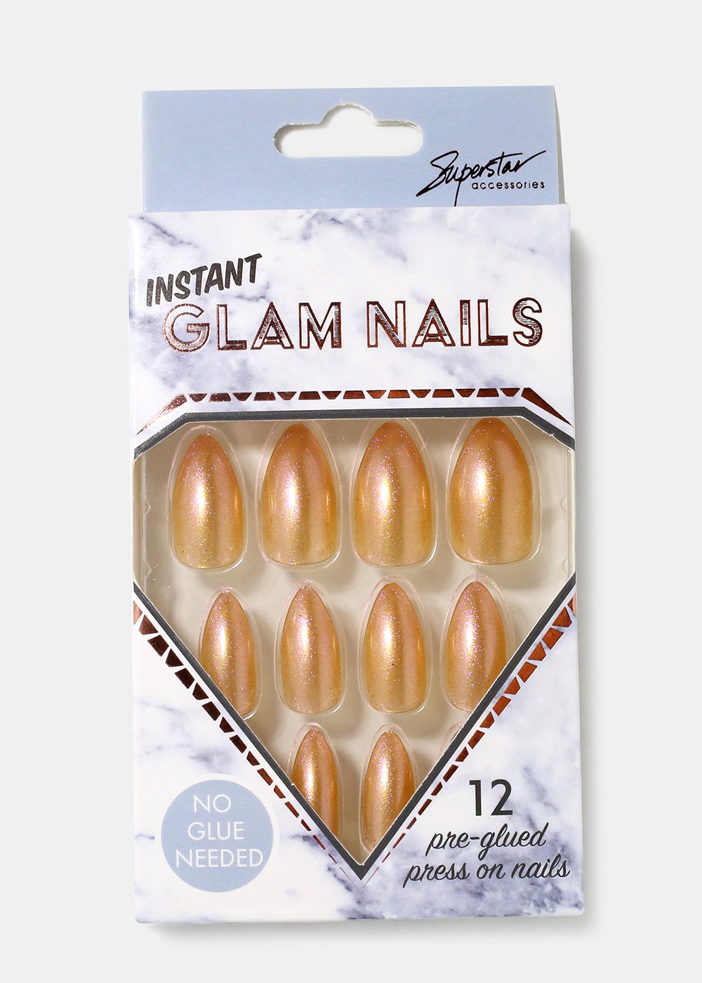 Pack of 12 almond-shaped press-on nails in gorgeous pearlescent shimmer tones. A fun look and easy to apply, no glue required!