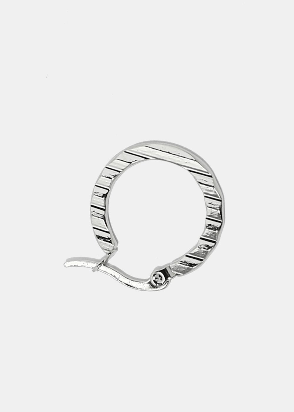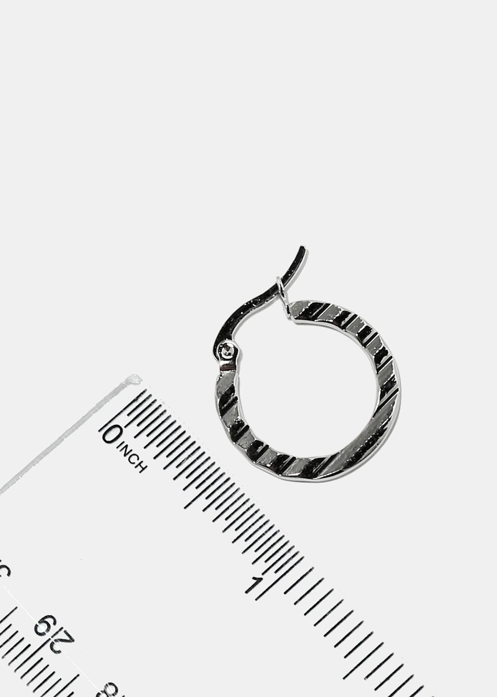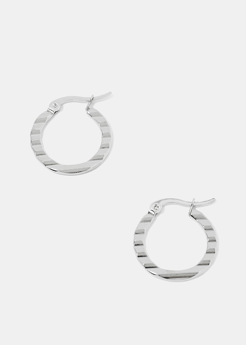 Small silver metal hoop earrings featuring a textured striped detail. These are perfect for any look from your everyday wear to a special night out! An essential addition to your jewelry box!