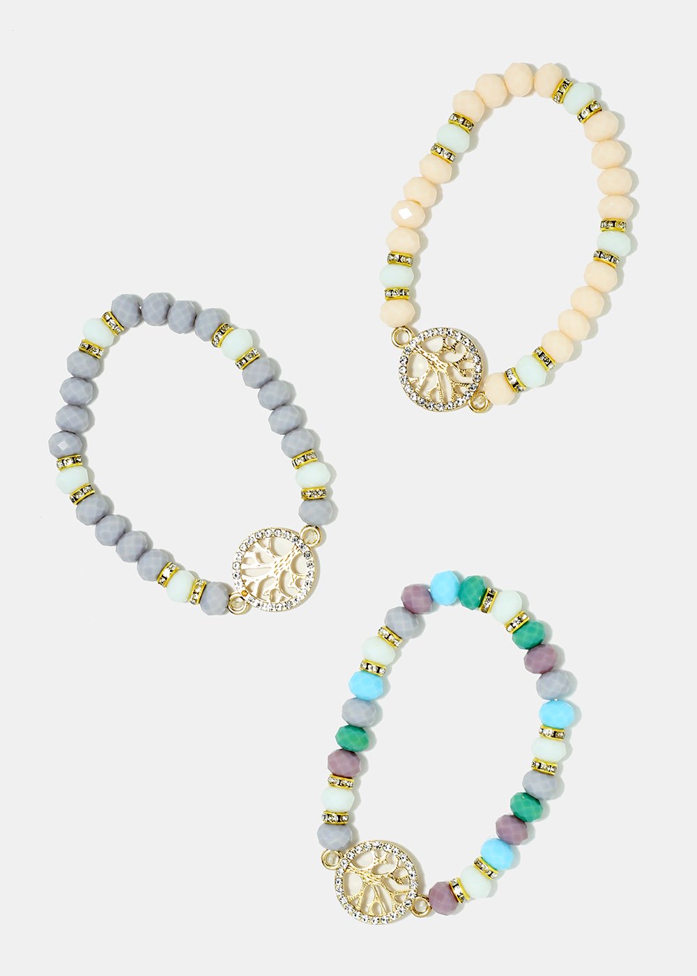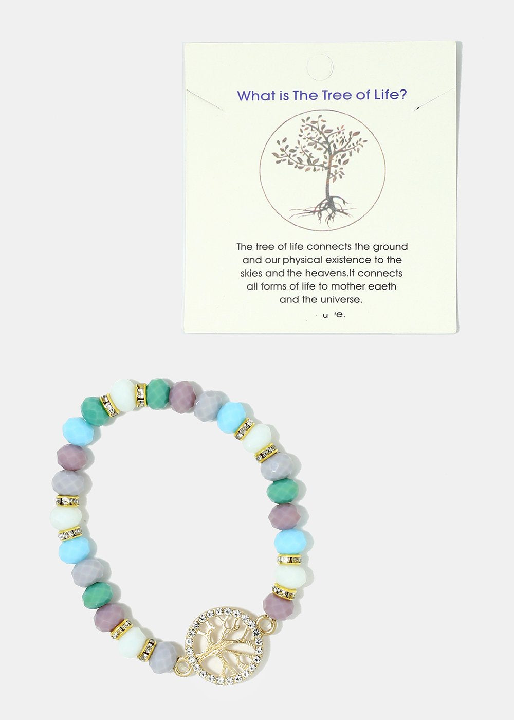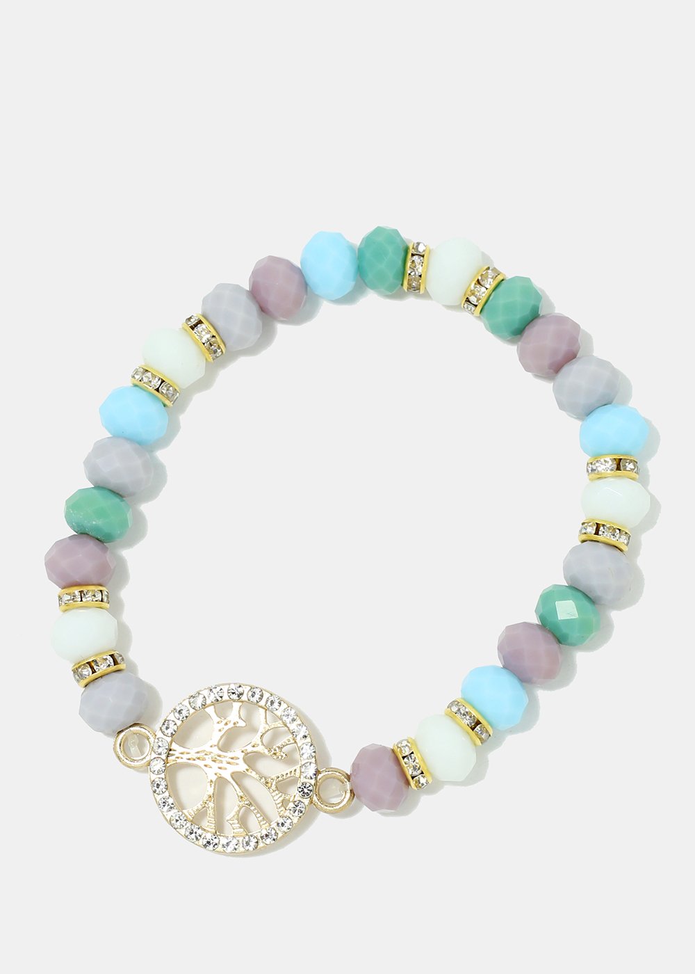 Multicolored beaded bracelet featuring a pretty rhinestone studded tree of life charm!