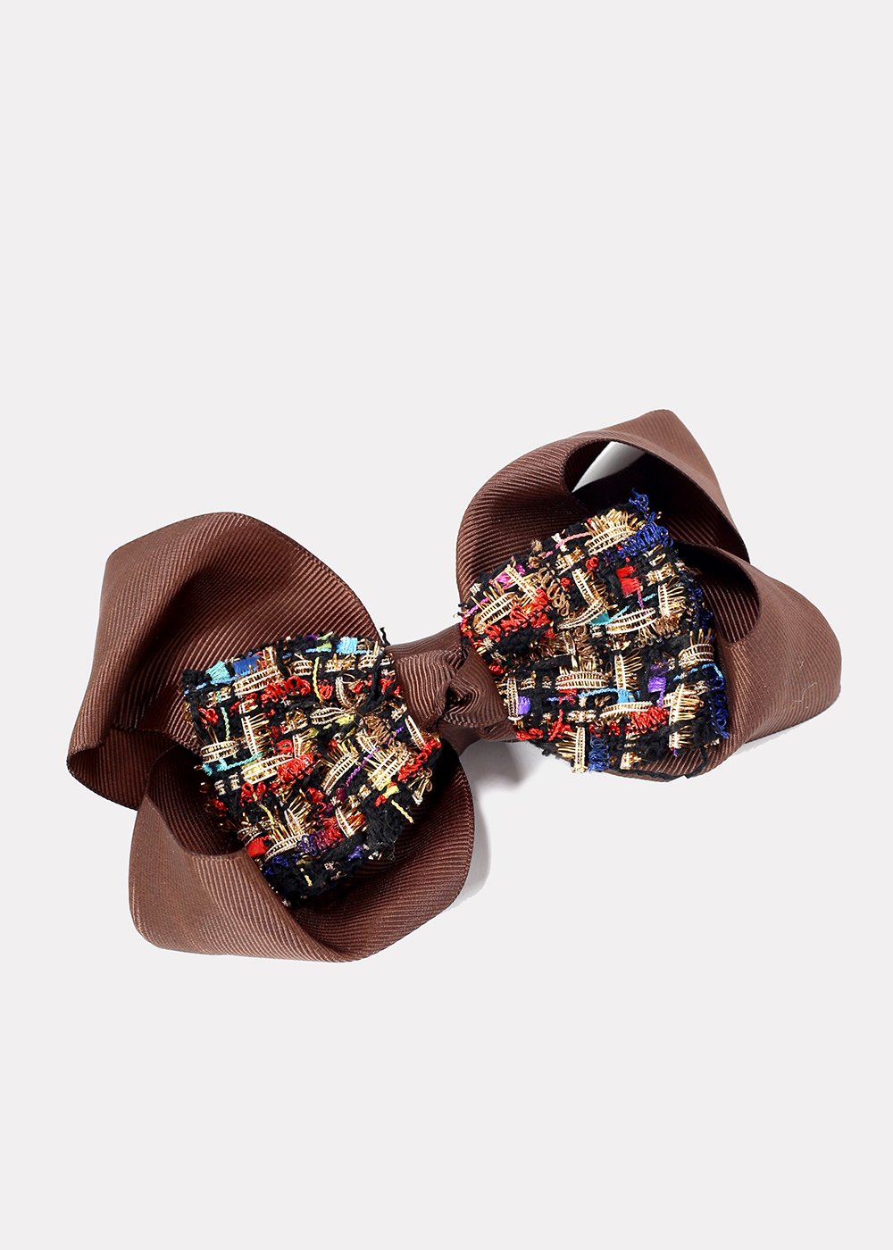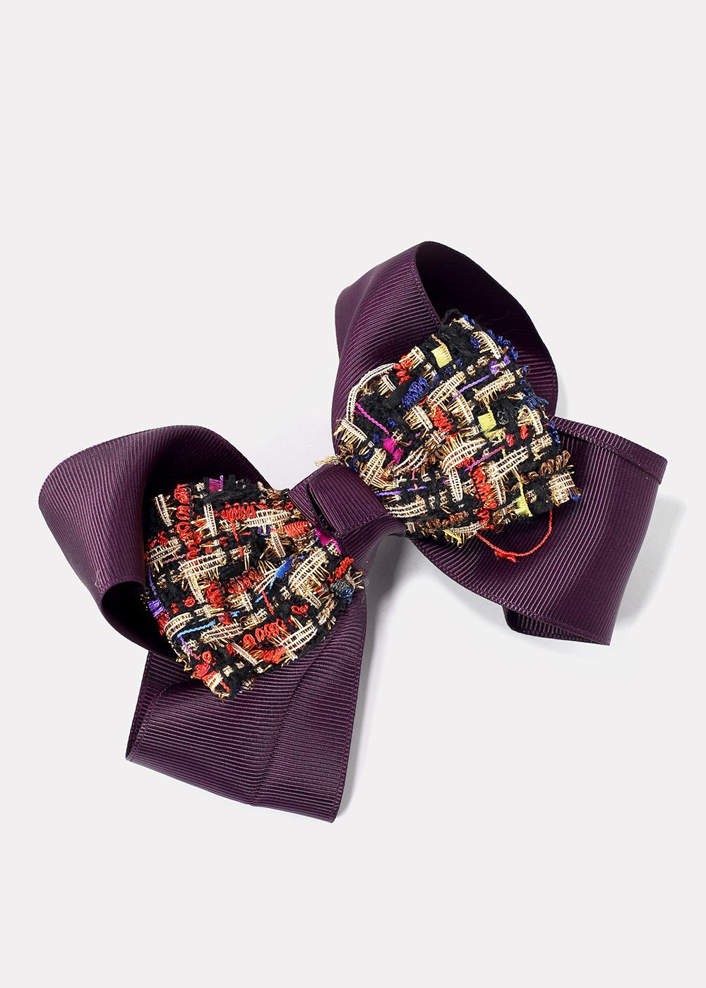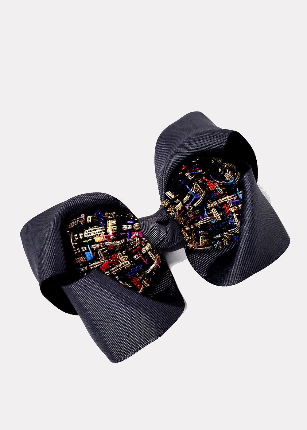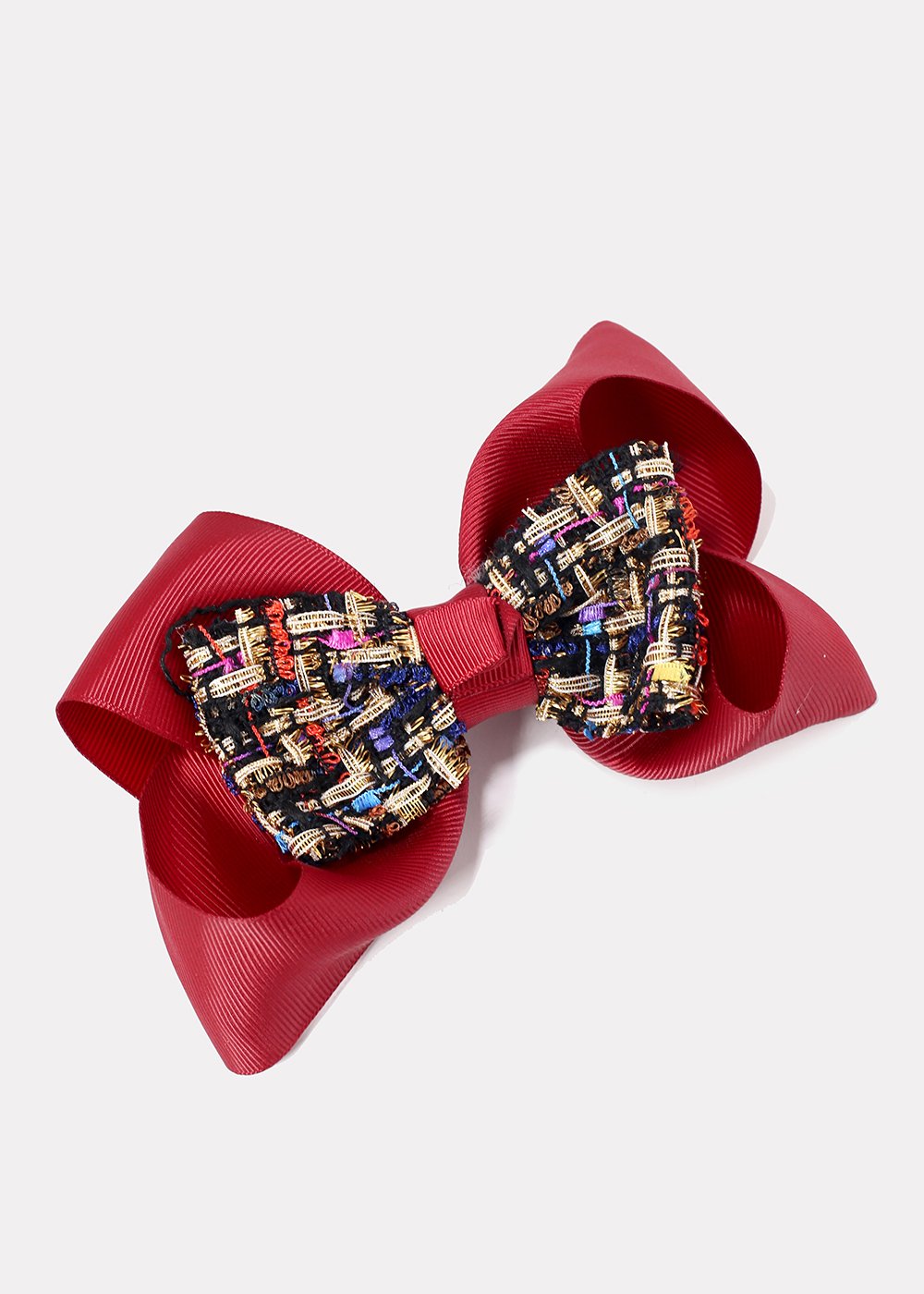Adorable double hair bow featuring solid color bow and small multi-color tweed fabric bow. A cute addition to you or your child's hairstyles!