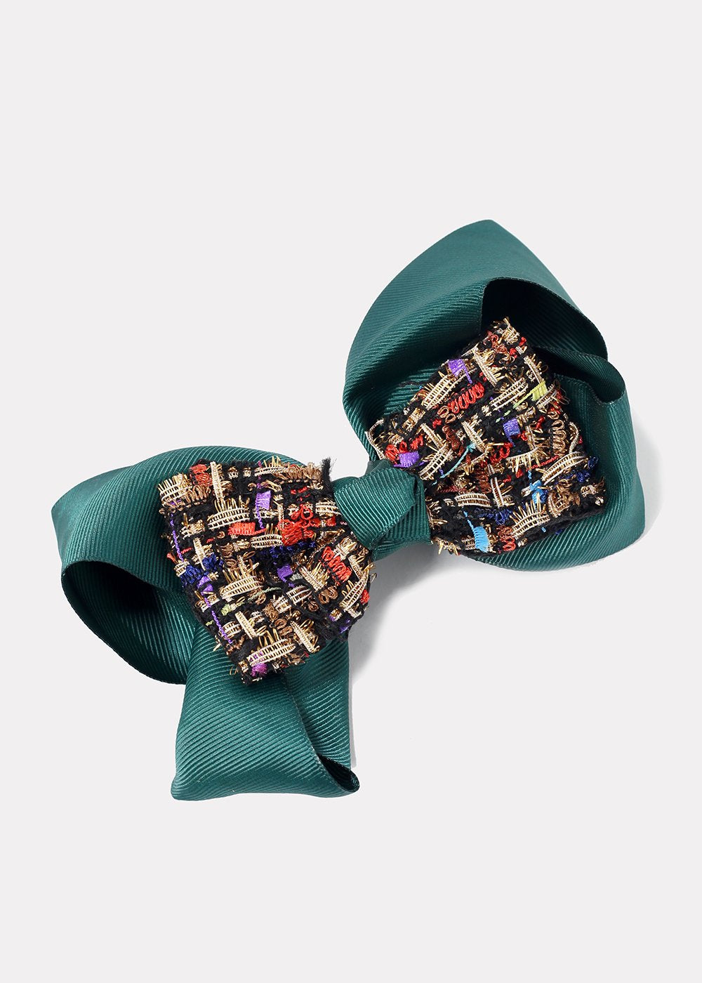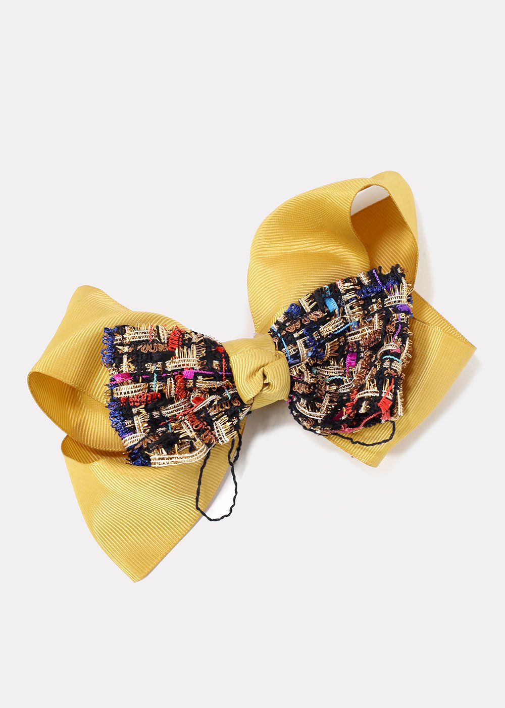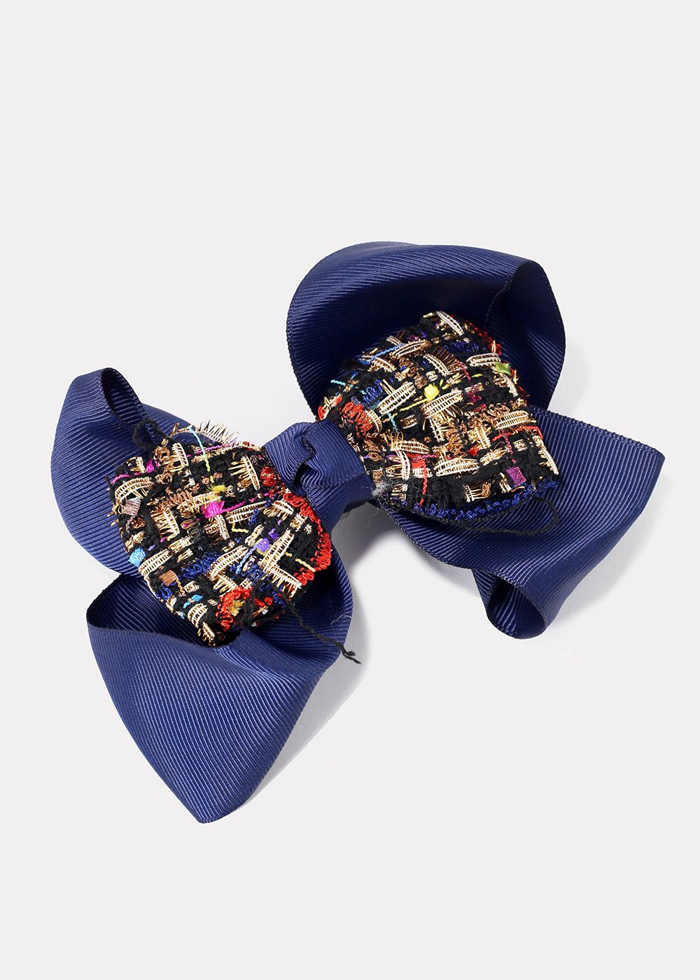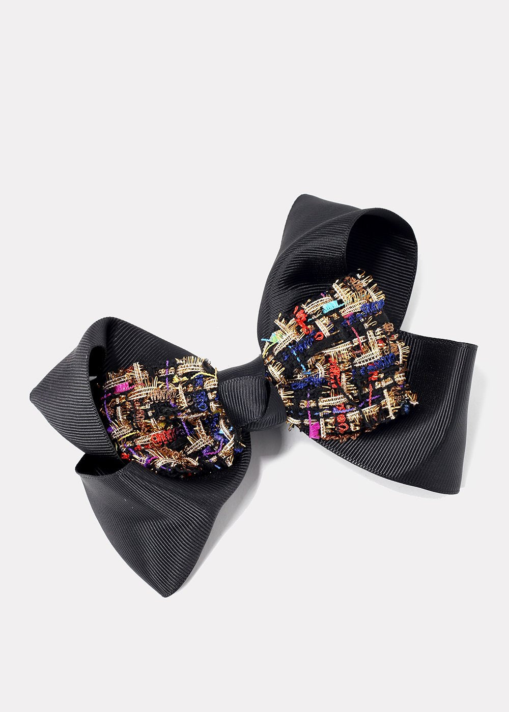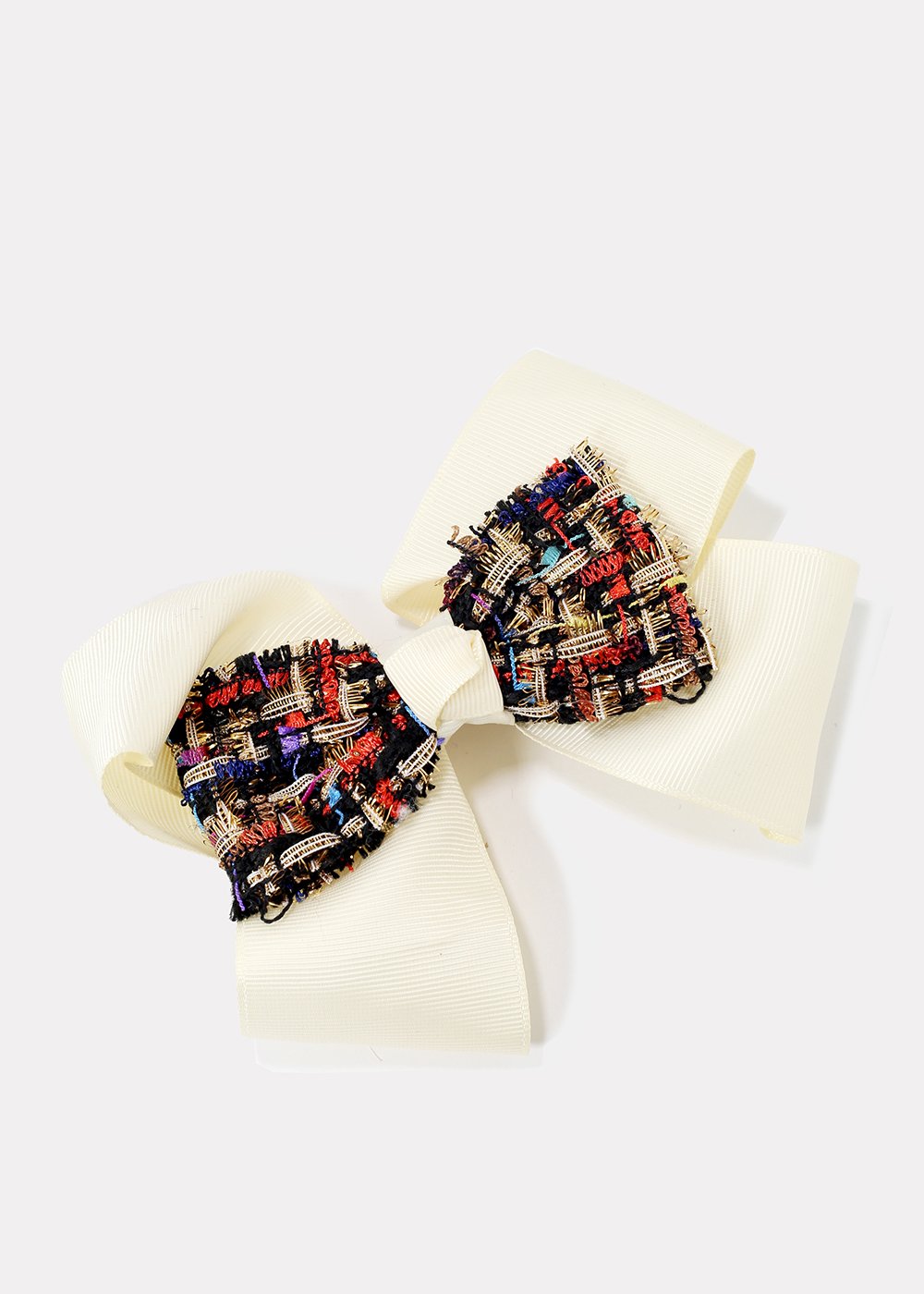 Adorable double hair bow featuring solid color bow and small multi-color tweed fabric bow. A cute addition to you or your child's hairstyles!