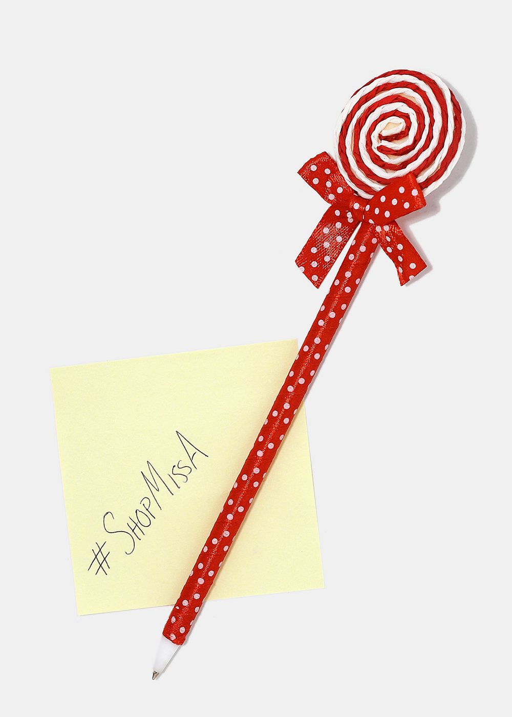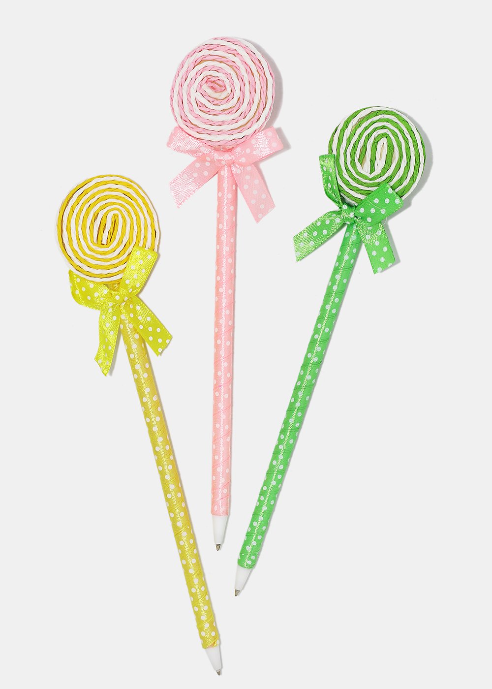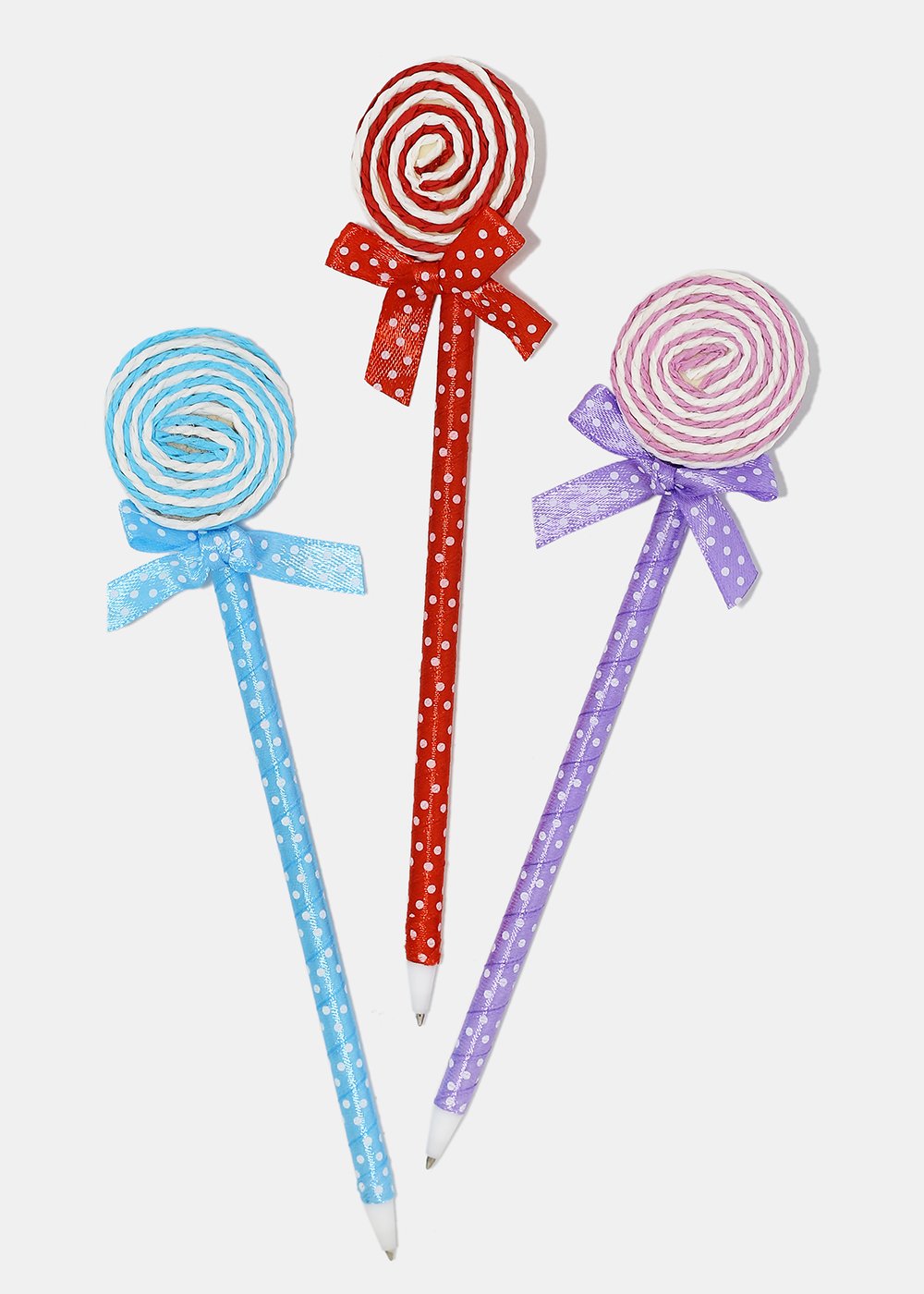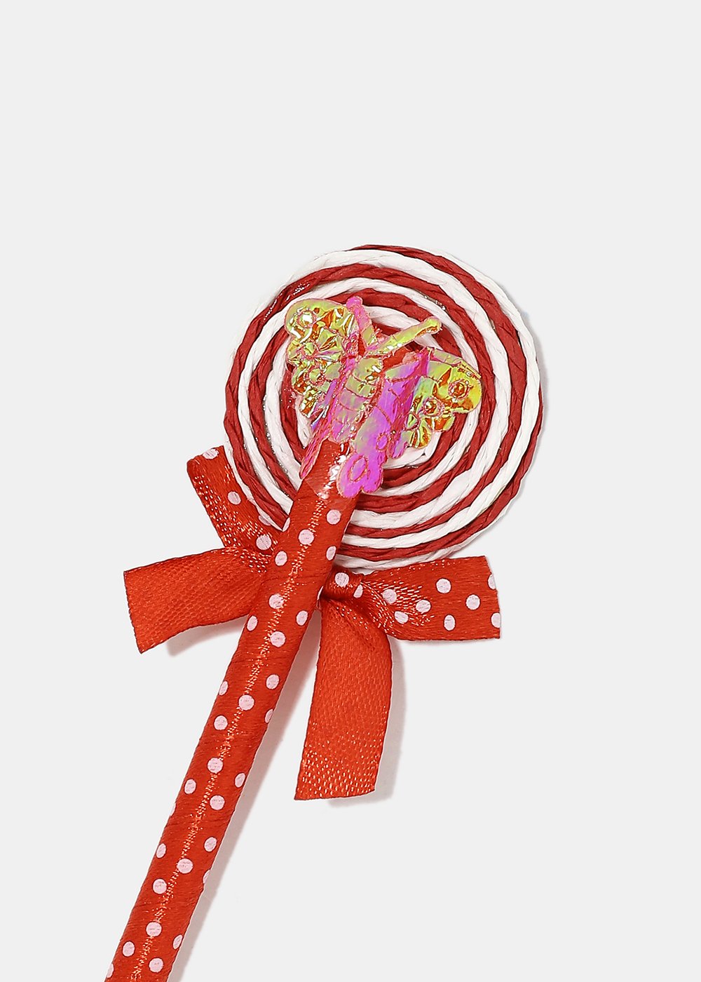 Adorable polka dot ribbon wrapped pens topped with twine lollipop and small holographic butterfly. A cute and playful addition to your set of pens!